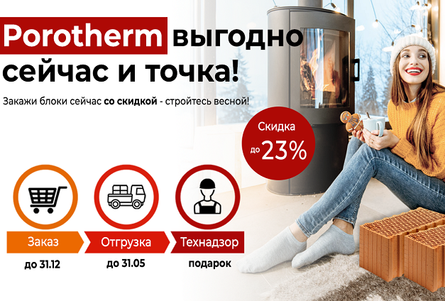 При покупке керамических блоков Porotherm до 31 декабря 2022 года, вы получаете скидку до 23% и бесплатное зимнее хранение до 31 мая 2023 года.